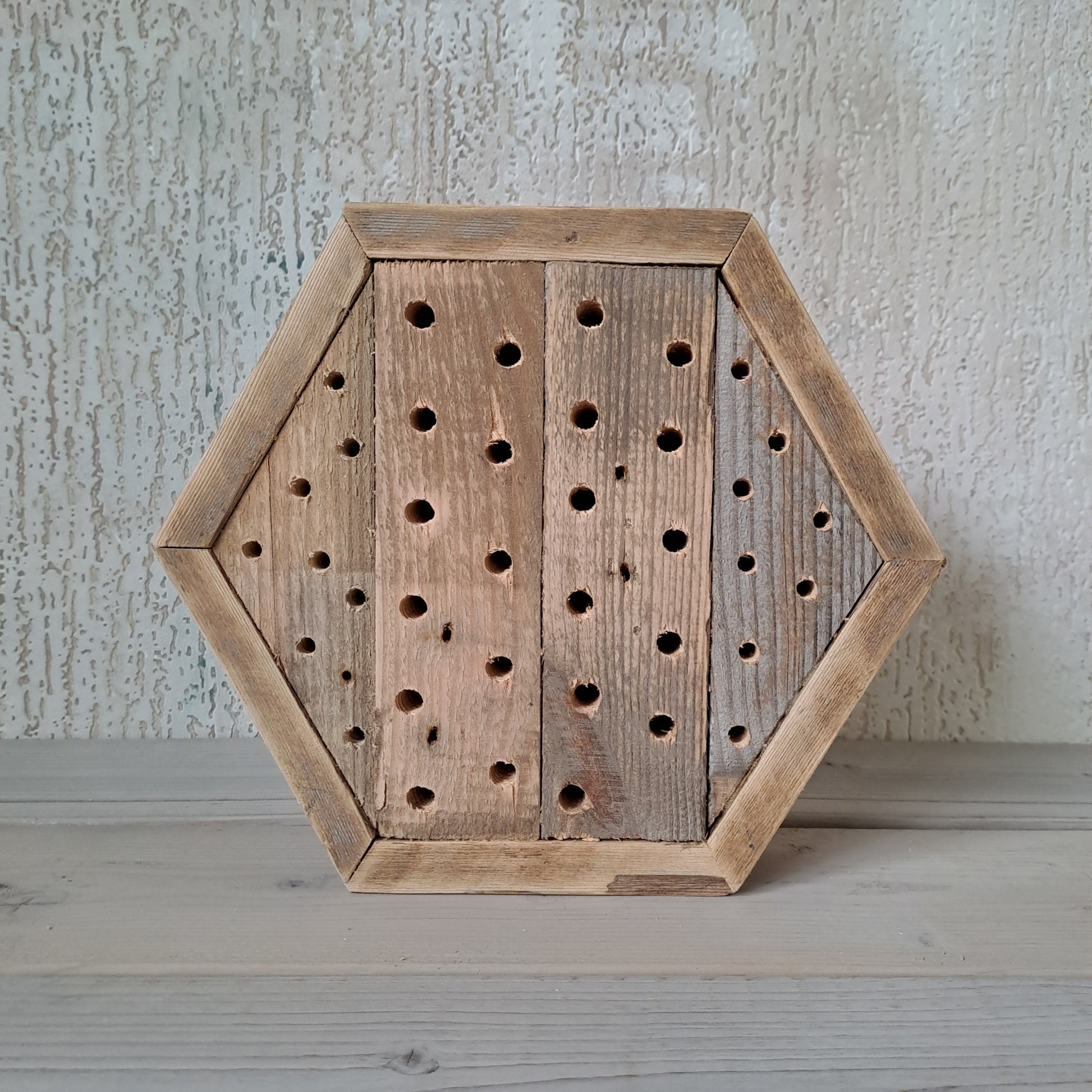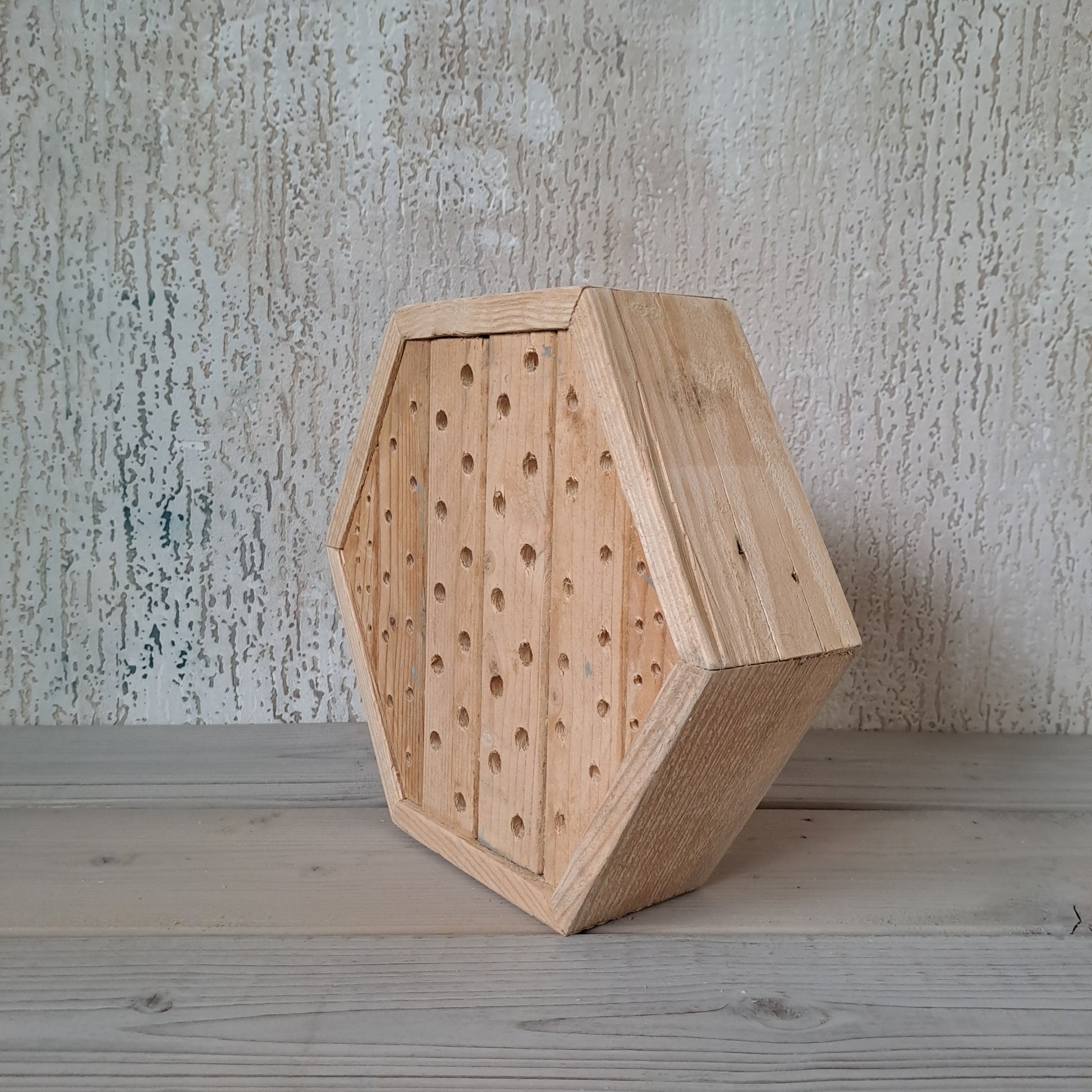 Met dit unieke handgemaakte houten insectenthotel in hongingraatvorm met voldoende woonruimte nodig jij deze nuttige vliegende bestuivers uit in jouw tuin.