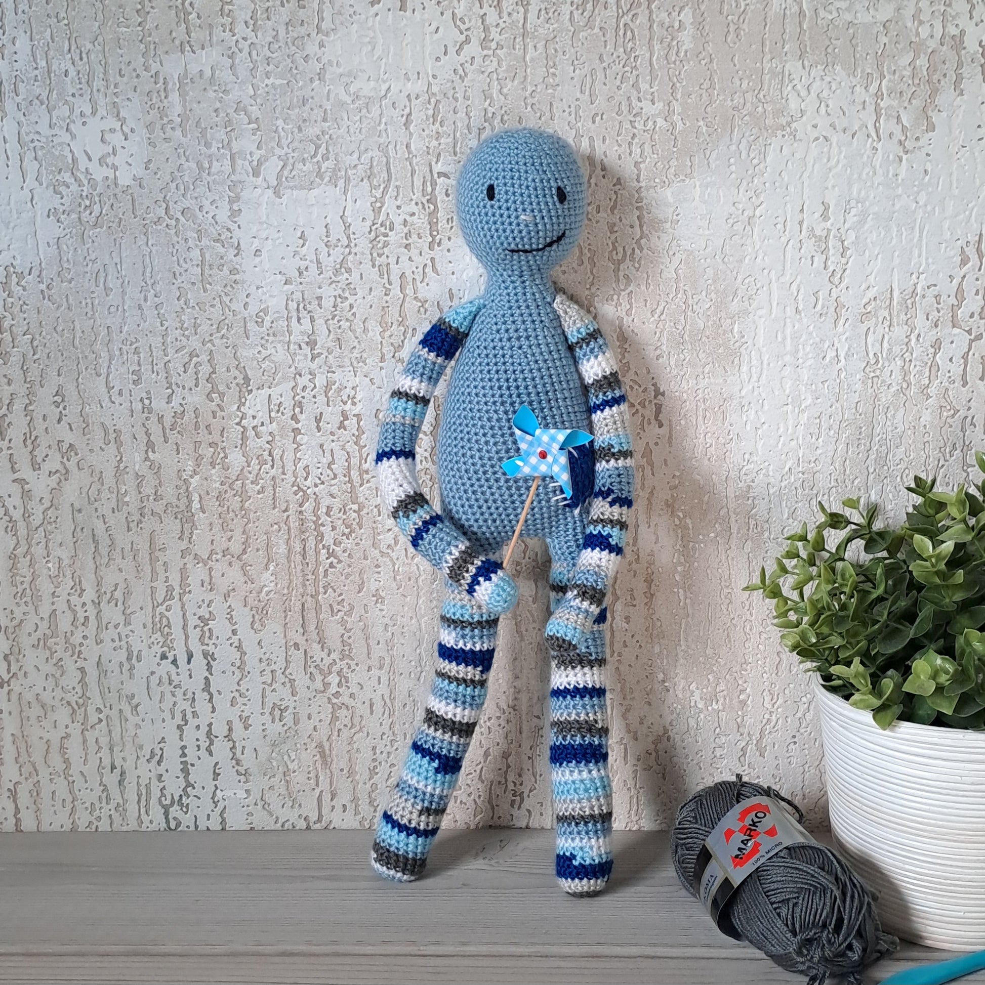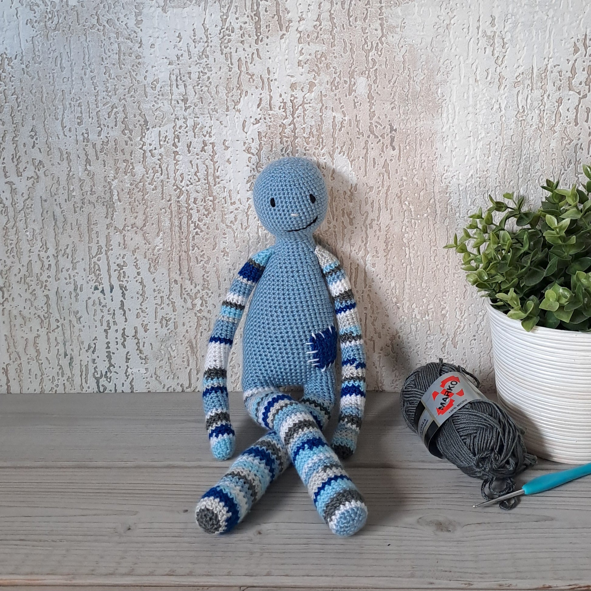 Filip is gehaakt in verschillende blauwtinten met vrolijk gestreepte armen en benen en zo'n 38cm hoog.
