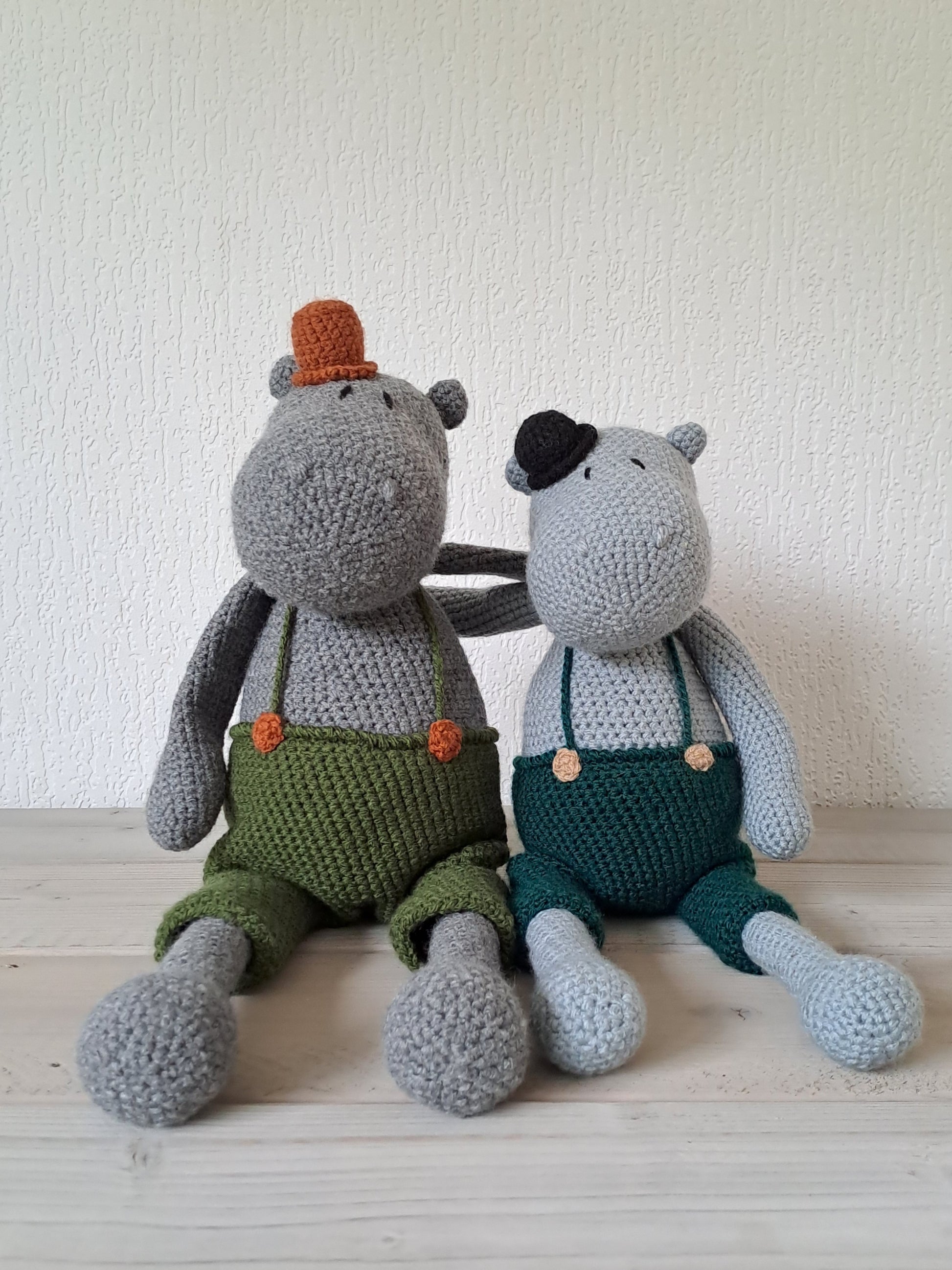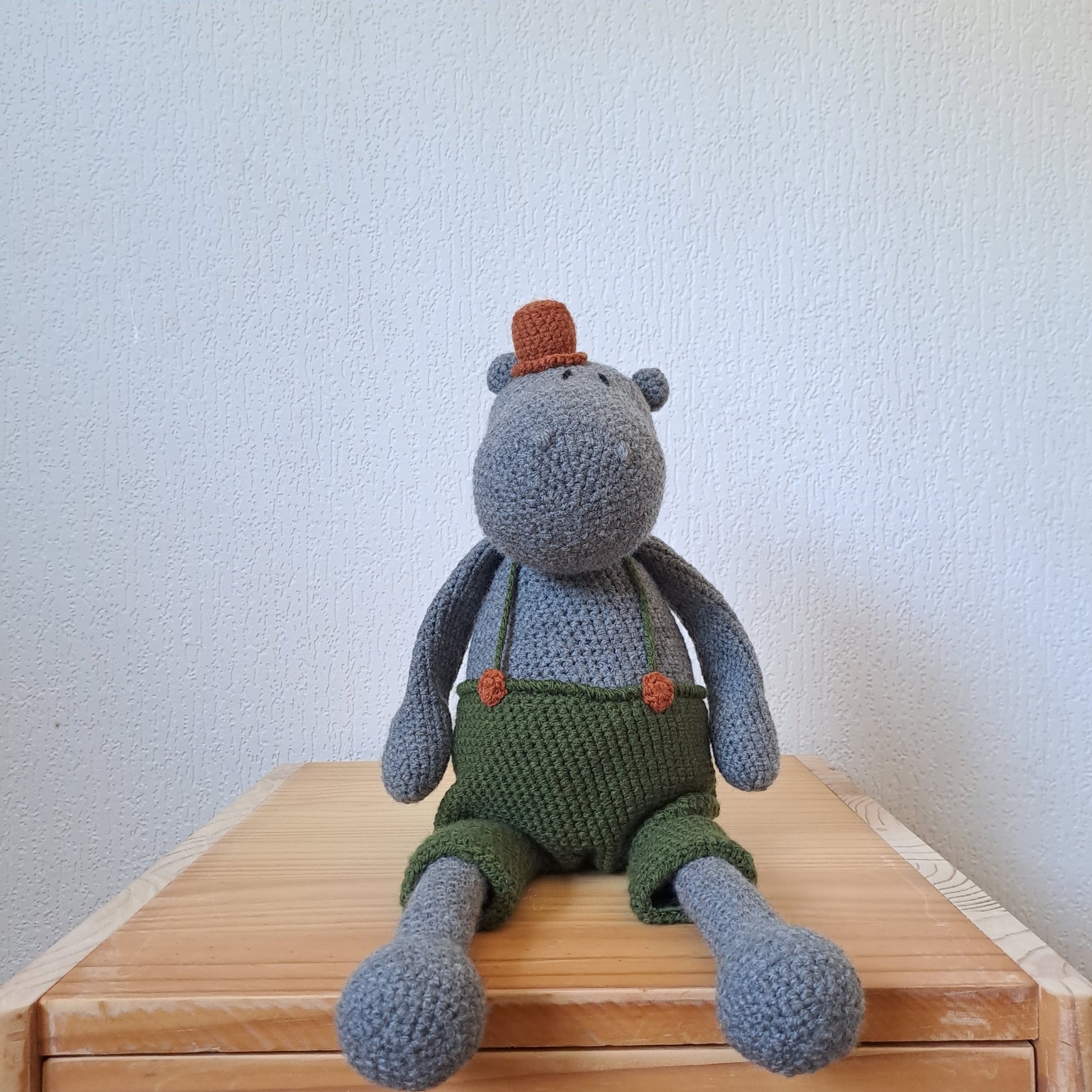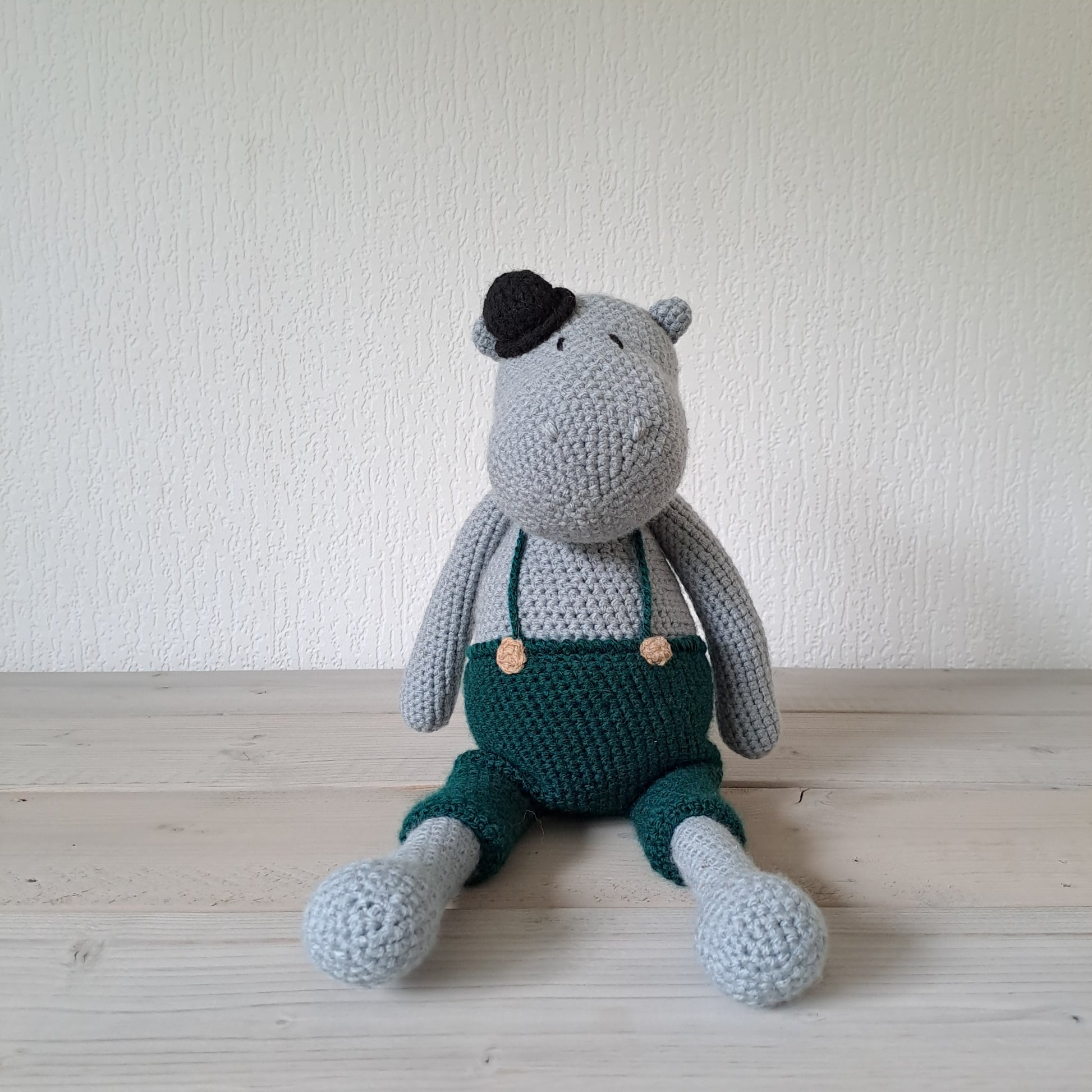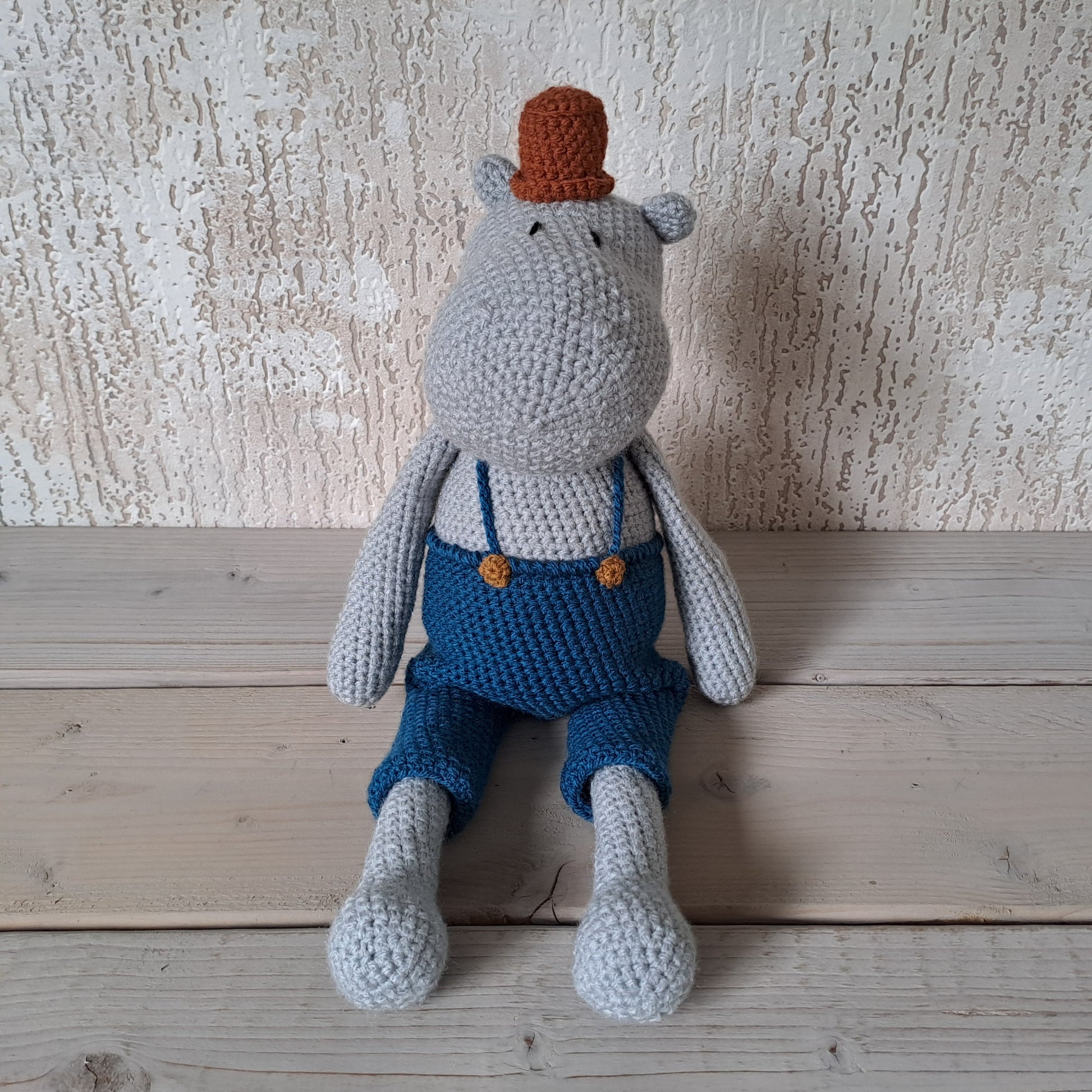 Dit heerlijk knuffelige gehaakte nijlpaard met tuinbroek en hoed is goed voor uren speelplezier! Door zijn uiterlijk zit hij ook nog eens leuk in je kamer!