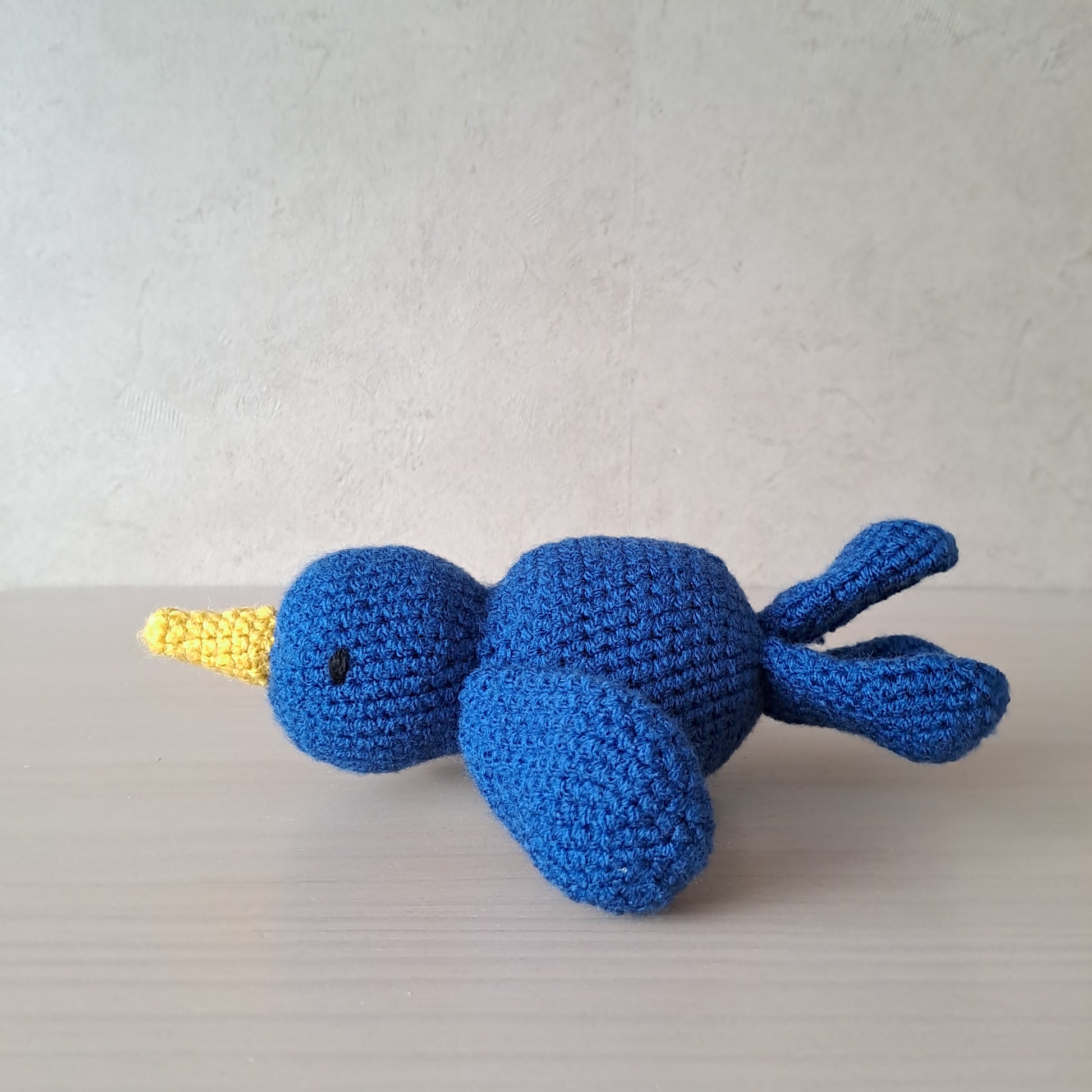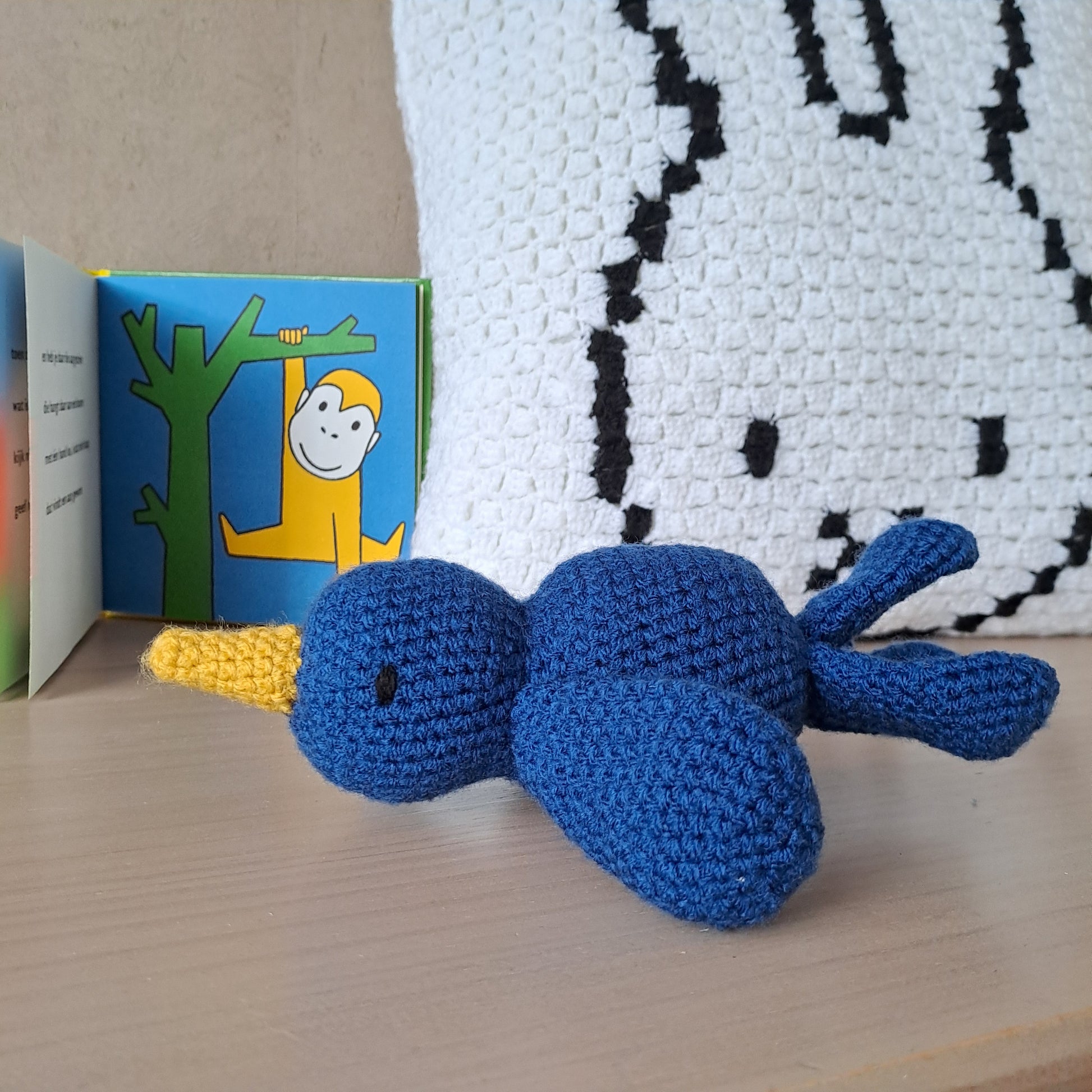 In mooi koningsblauw gehaakt komt hij naar je toe vliegen om mee te knuffelen samen met de andere knuffelvriendjes.