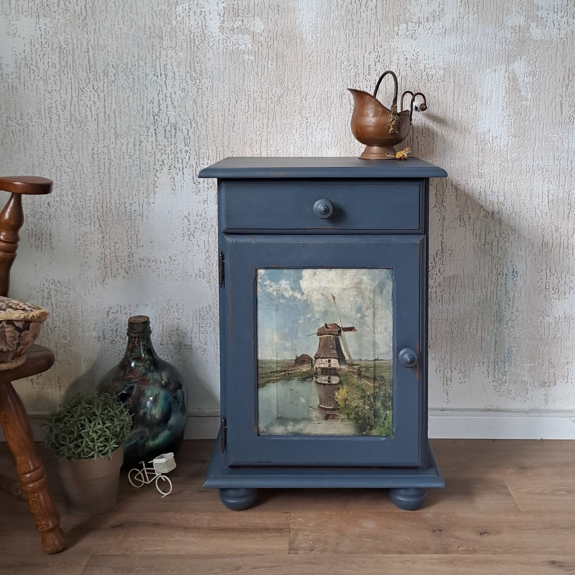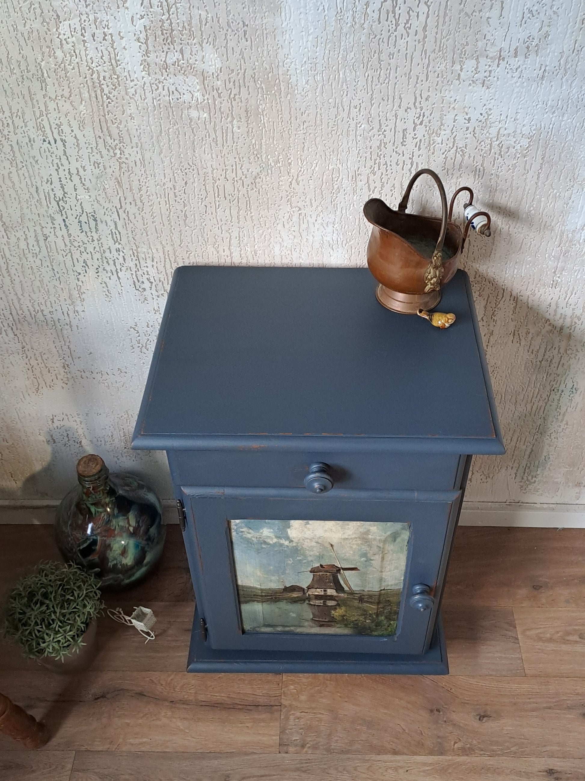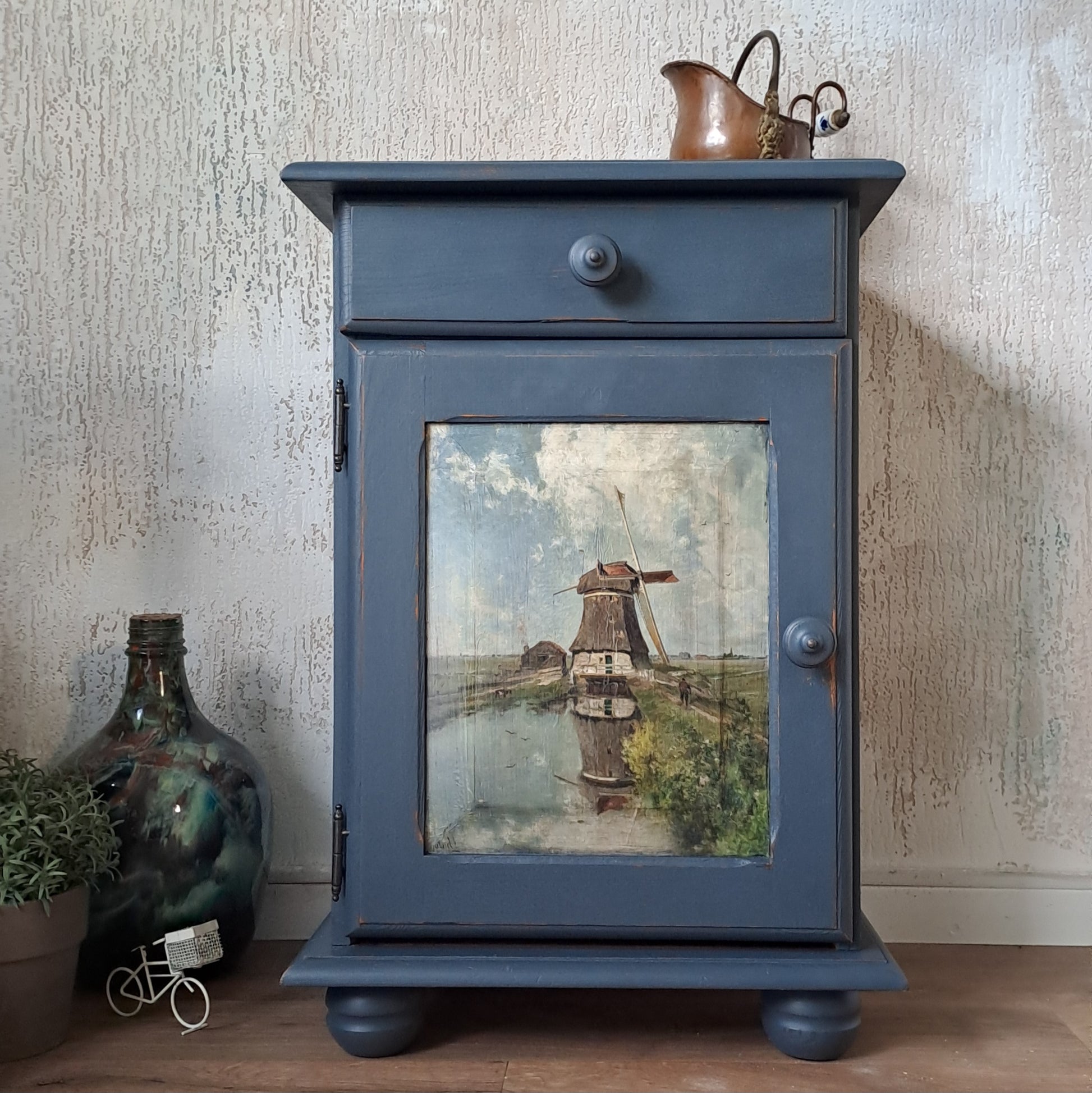Dit nachtkastje heeft een nieuwe oud Hollandse look gekregen met een afbeelding van een windmolen op het deurtje. Het kastje met lade kreeg een mooi bijpassende blauwe kleur en de echt oude look door de randen door te schuren.