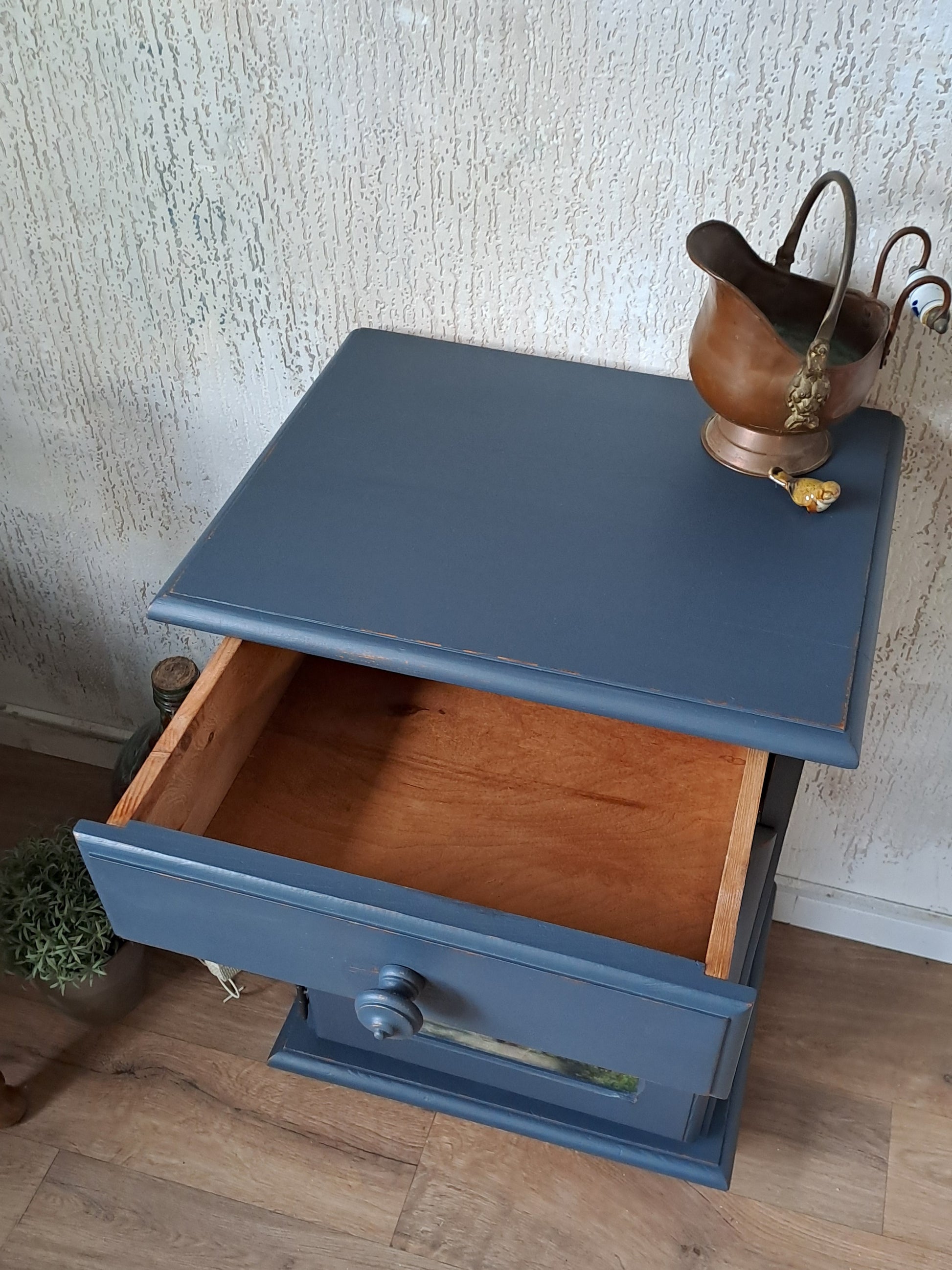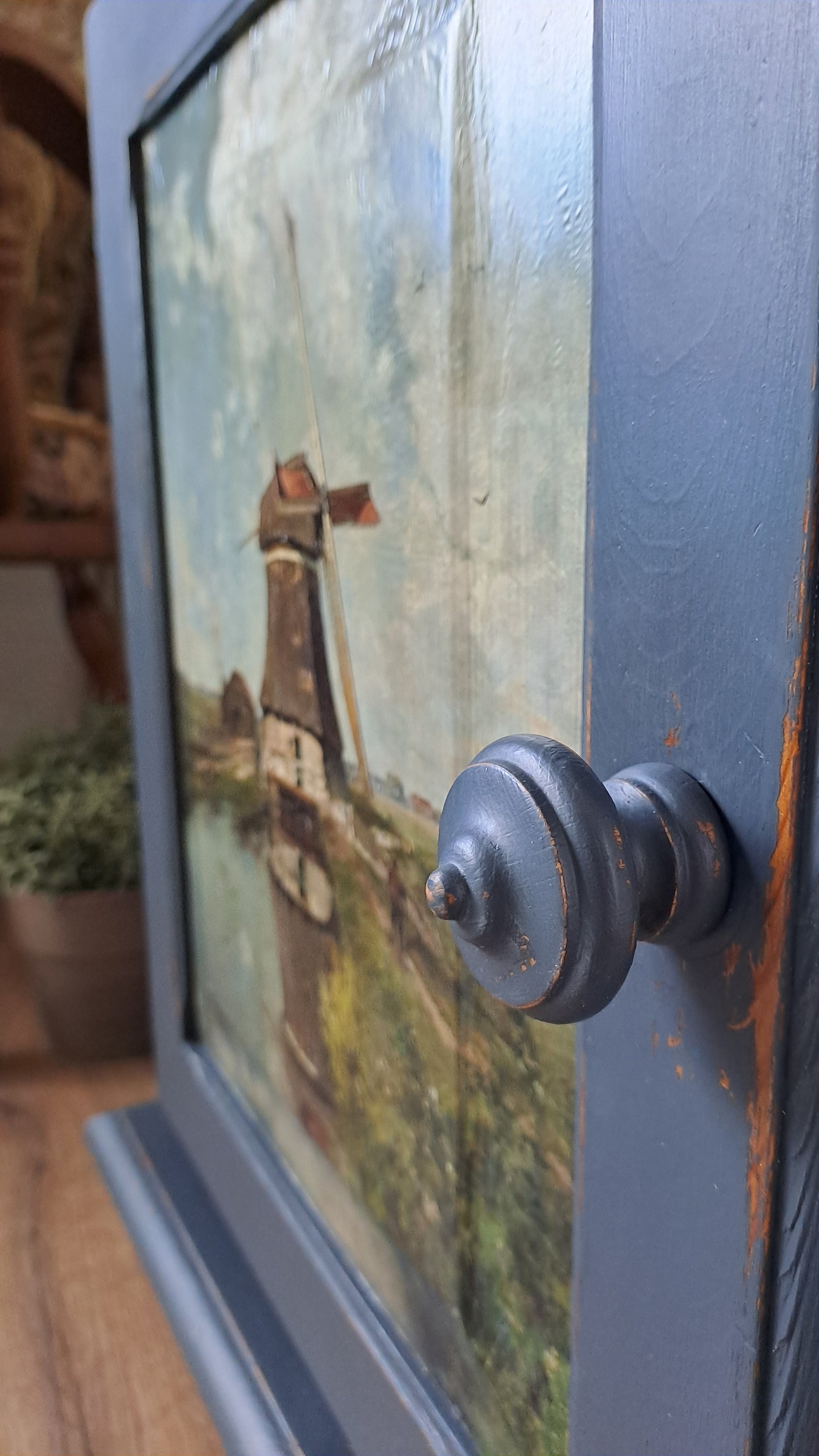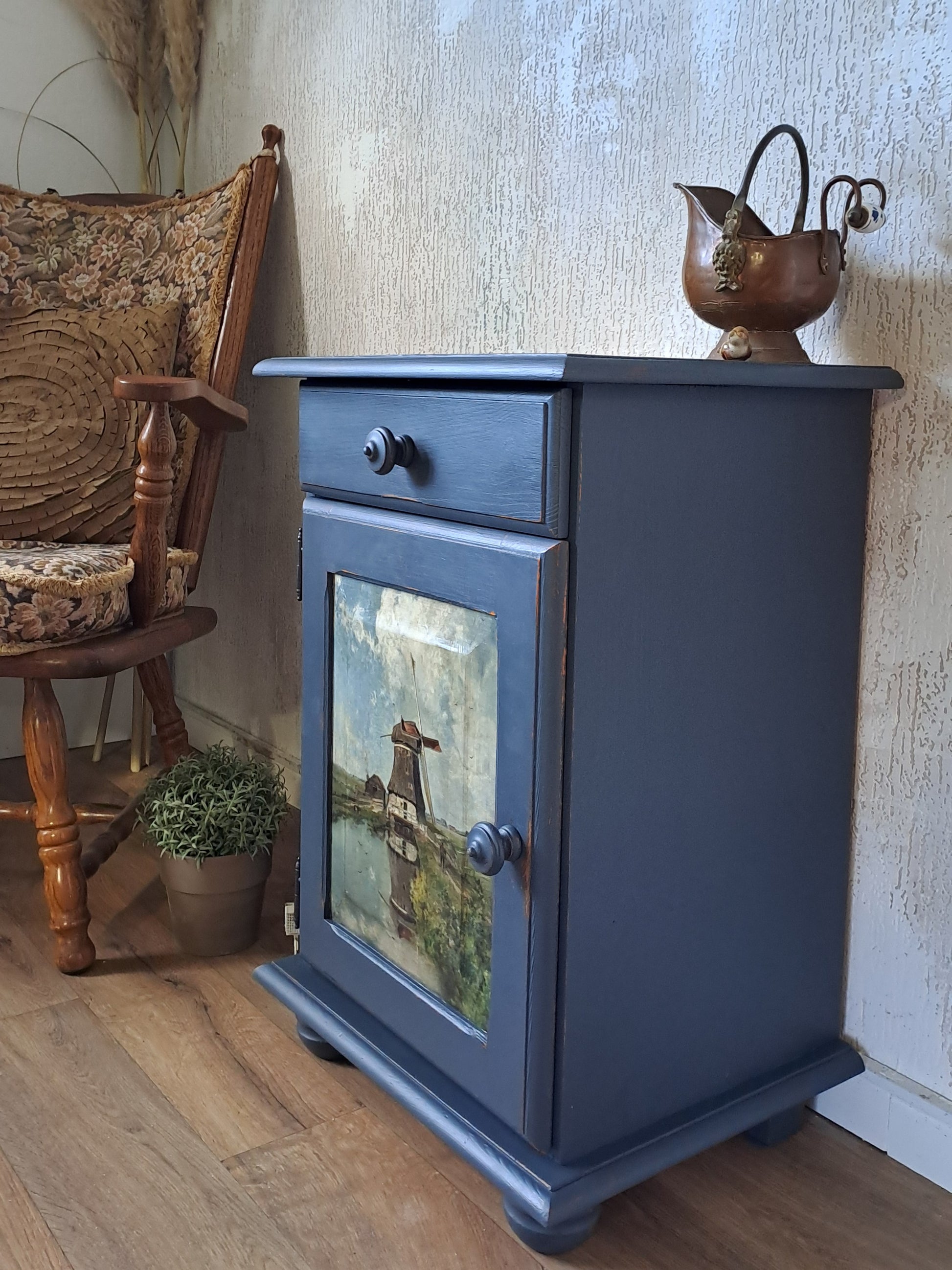 Dit nachtkastje heeft een nieuwe oud Hollandse look gekregen met een afbeelding van een windmolen op het deurtje. Het kastje met lade kreeg een mooi bijpassende blauwe kleur en de echt oude look door de randen door te schuren.