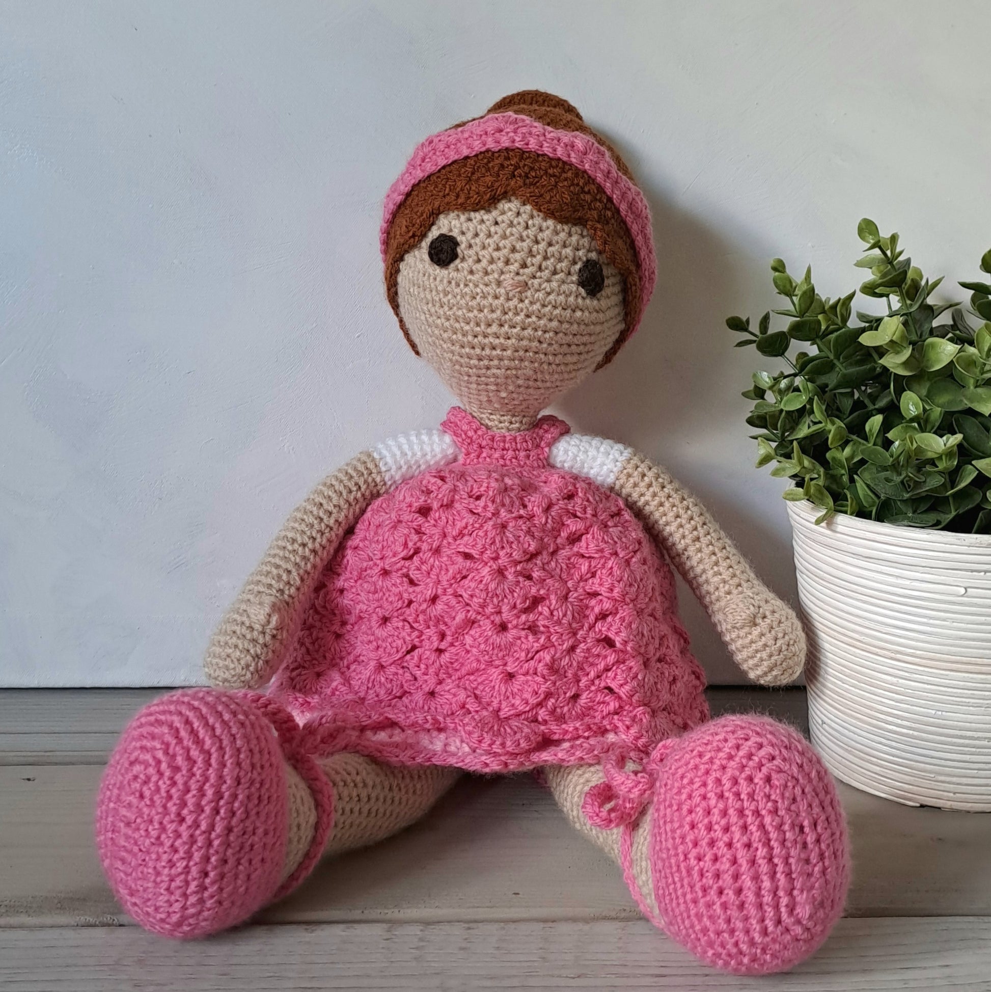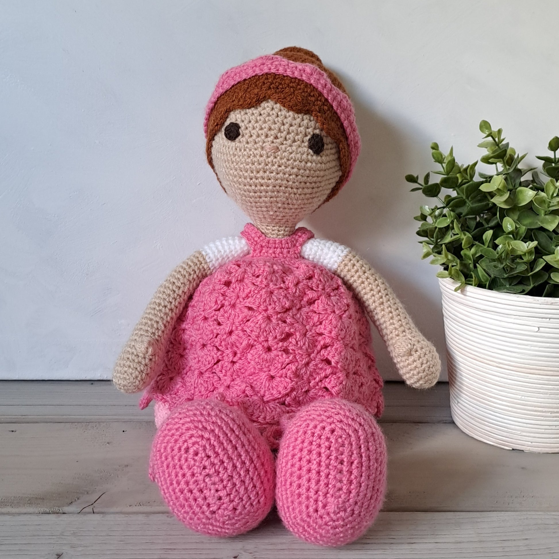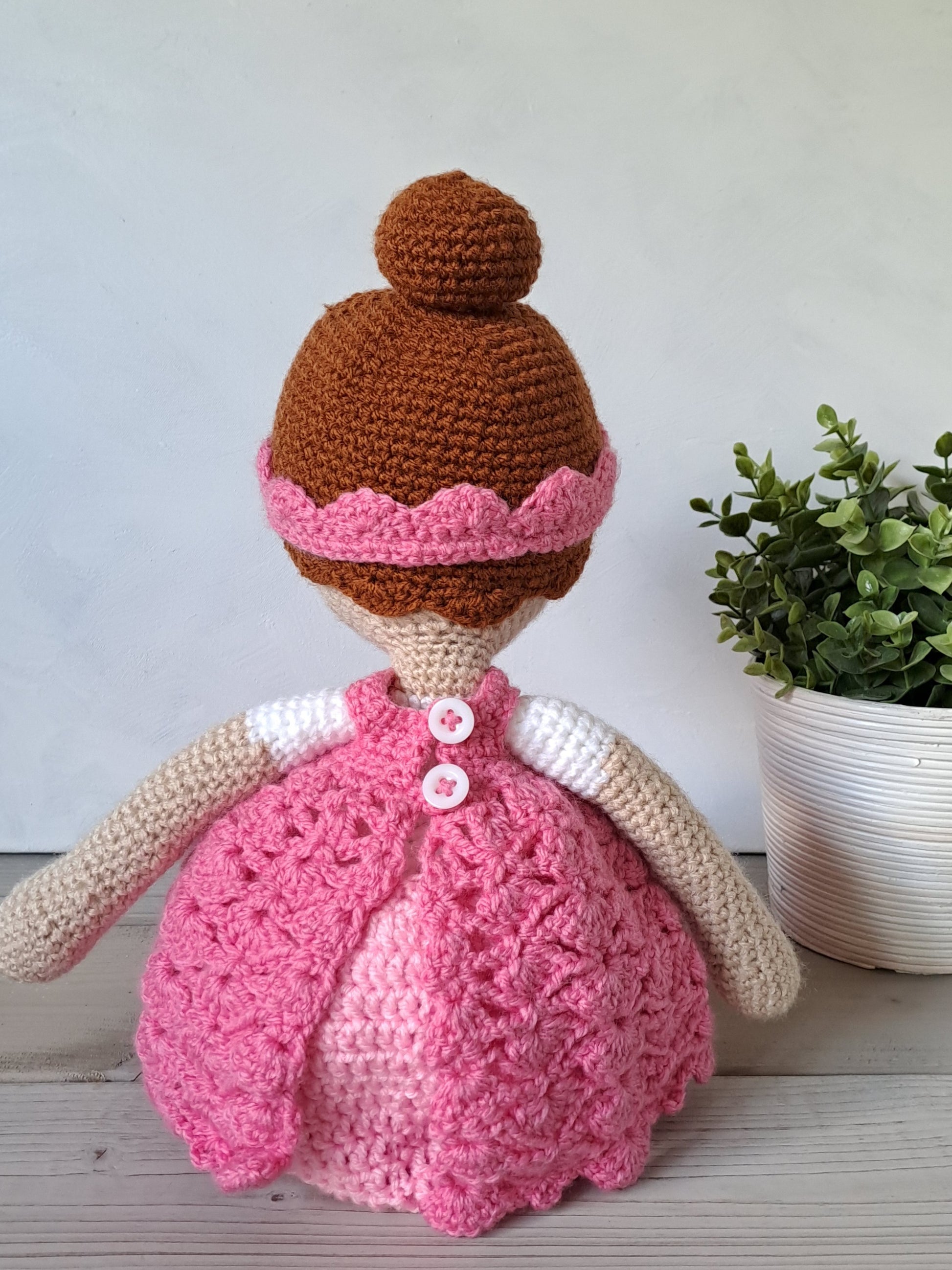 Een gehaakte prinsessenpop van formaat in een betoverende roze jurk en een kroon die zelfs echte royalty jaloers zou maken.