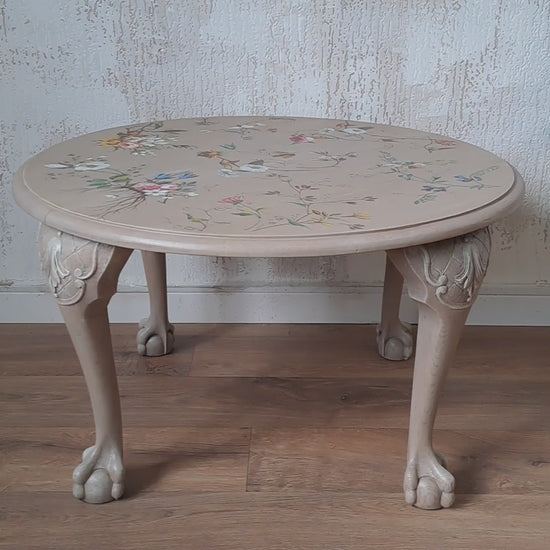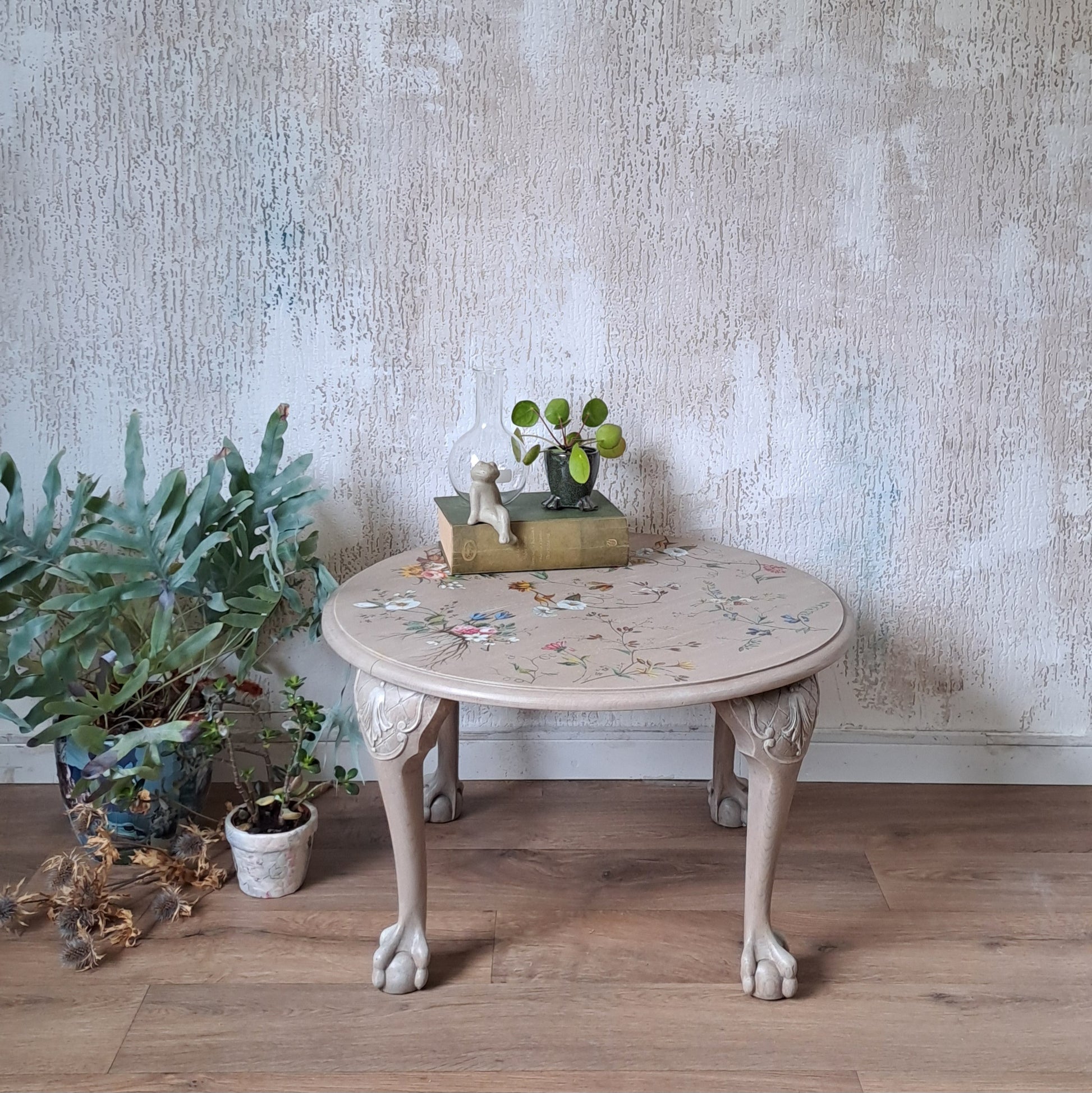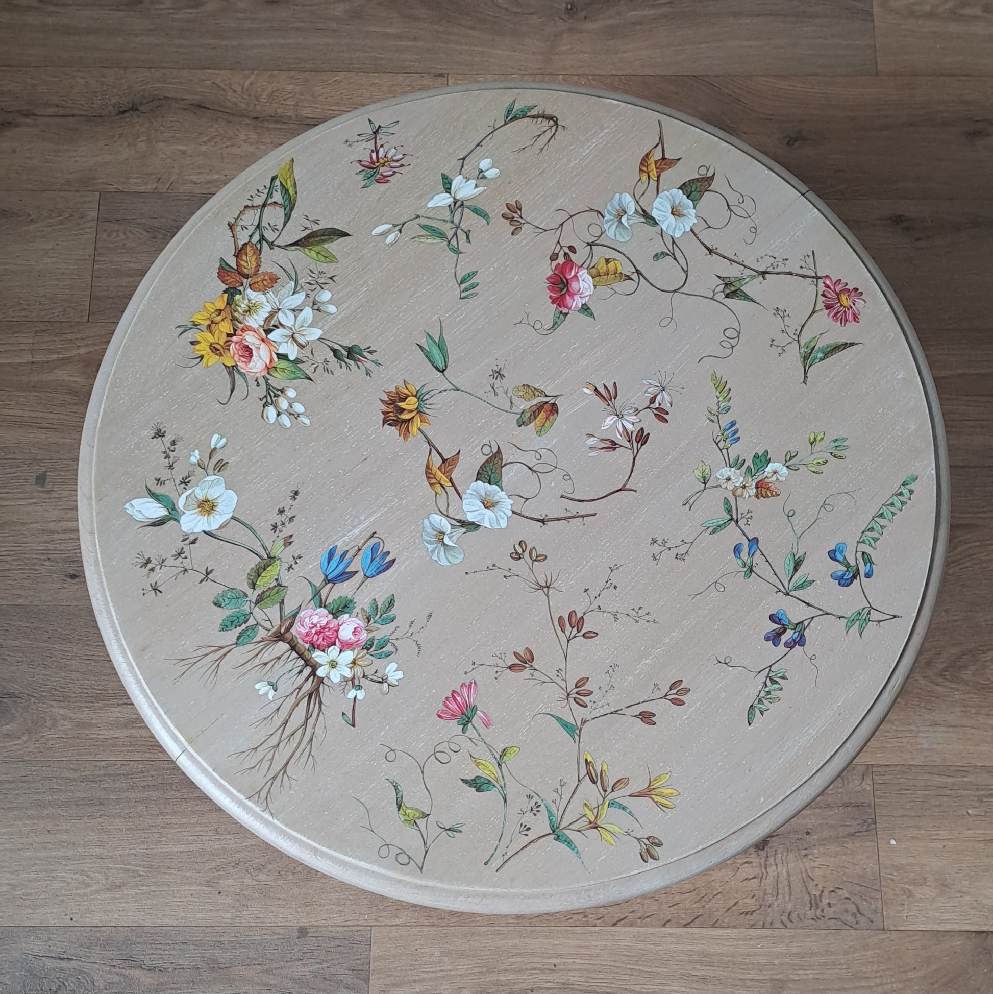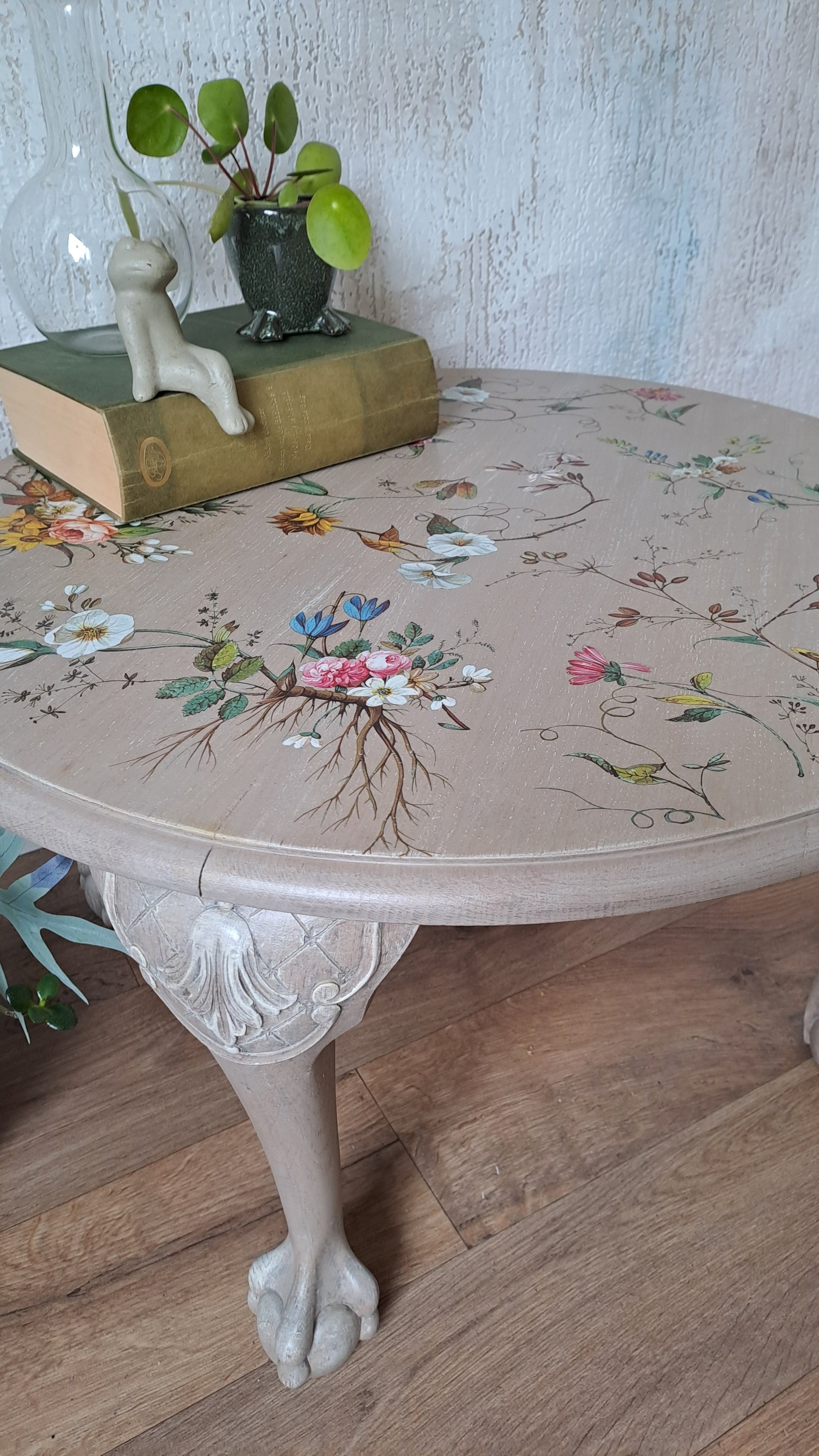 Dit sierlijke bijzettafeltje in blank hout is voorzien van een whitewash en bloemenprint op de bovenzijde.