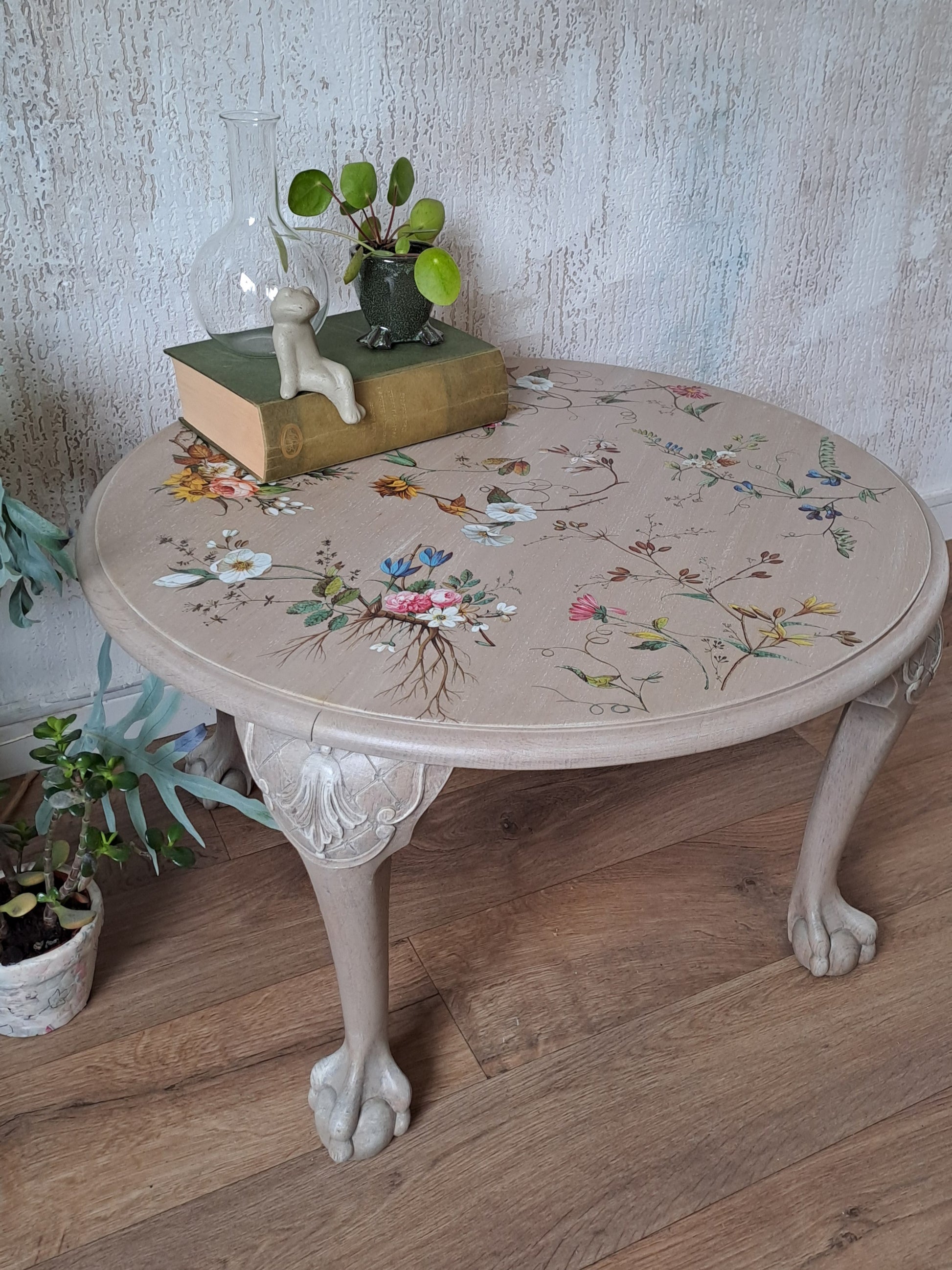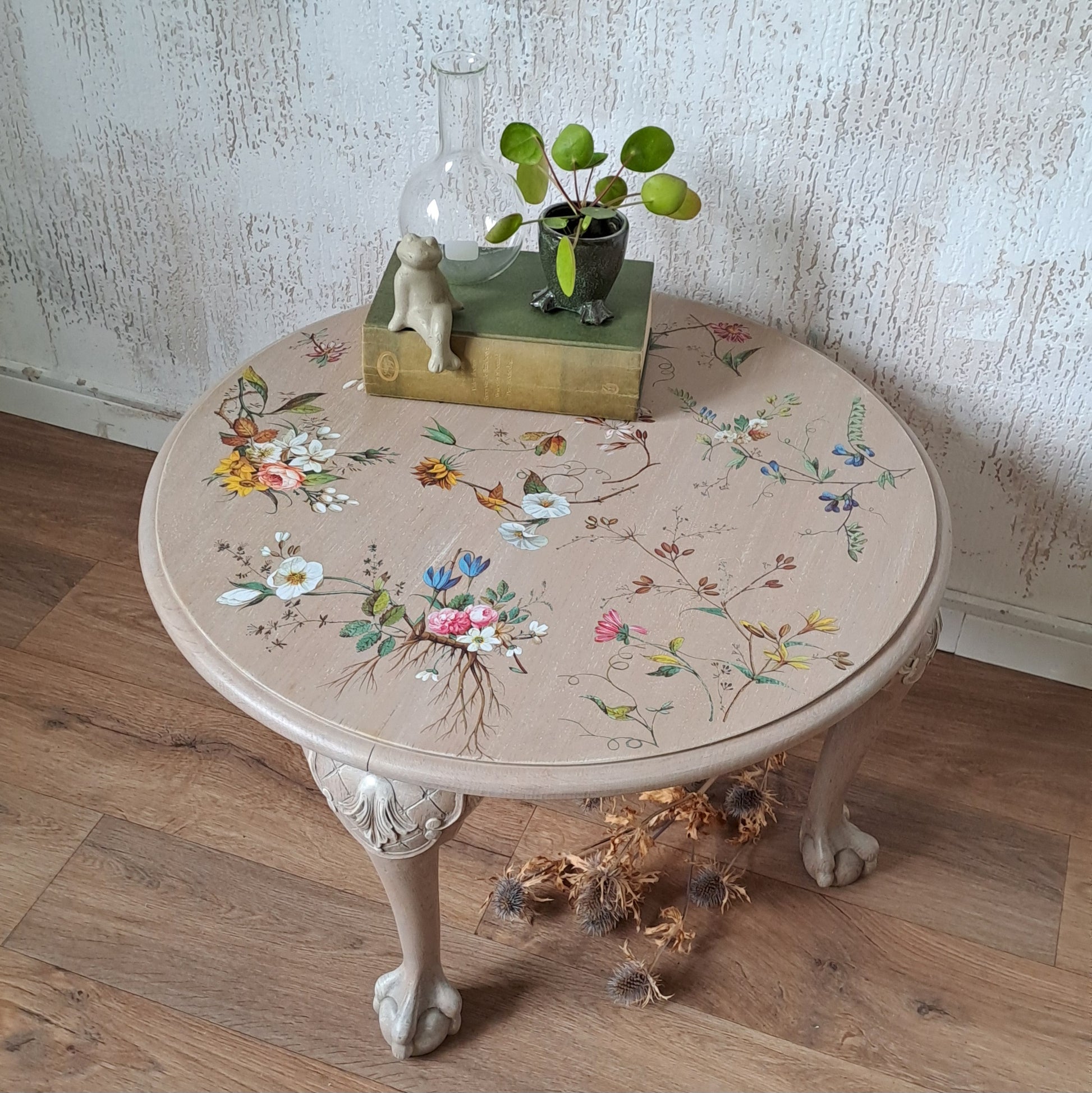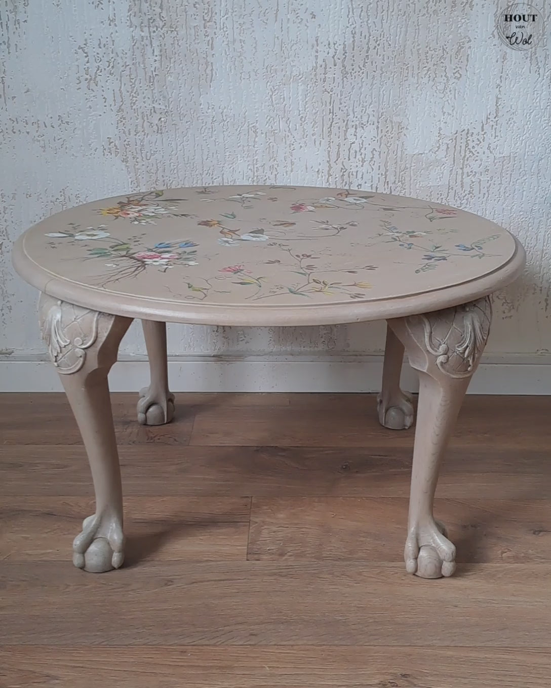 De bloemenprint is een IOD transfer, beschermd door een vernislaag. Plaats het tafeltje niet in direct zonlicht. Hierdoor zal de transfer na verloop van tijd verbleken.