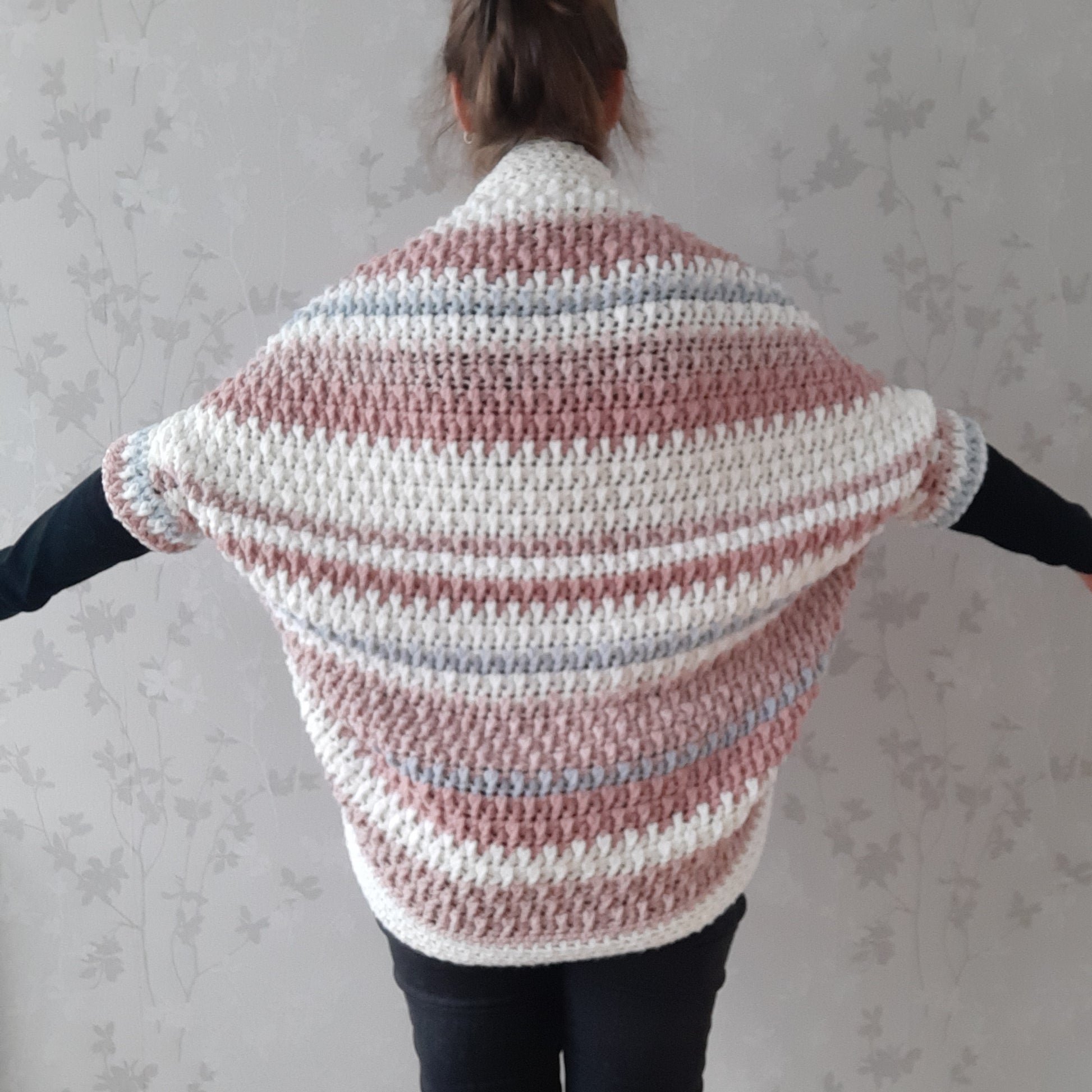 Gele shrug en wit-roze en vleugje blauw gestreept zijn gehaakt met 80% Acryl, 20% Wol (nauwelijks tot niet voelbaar)