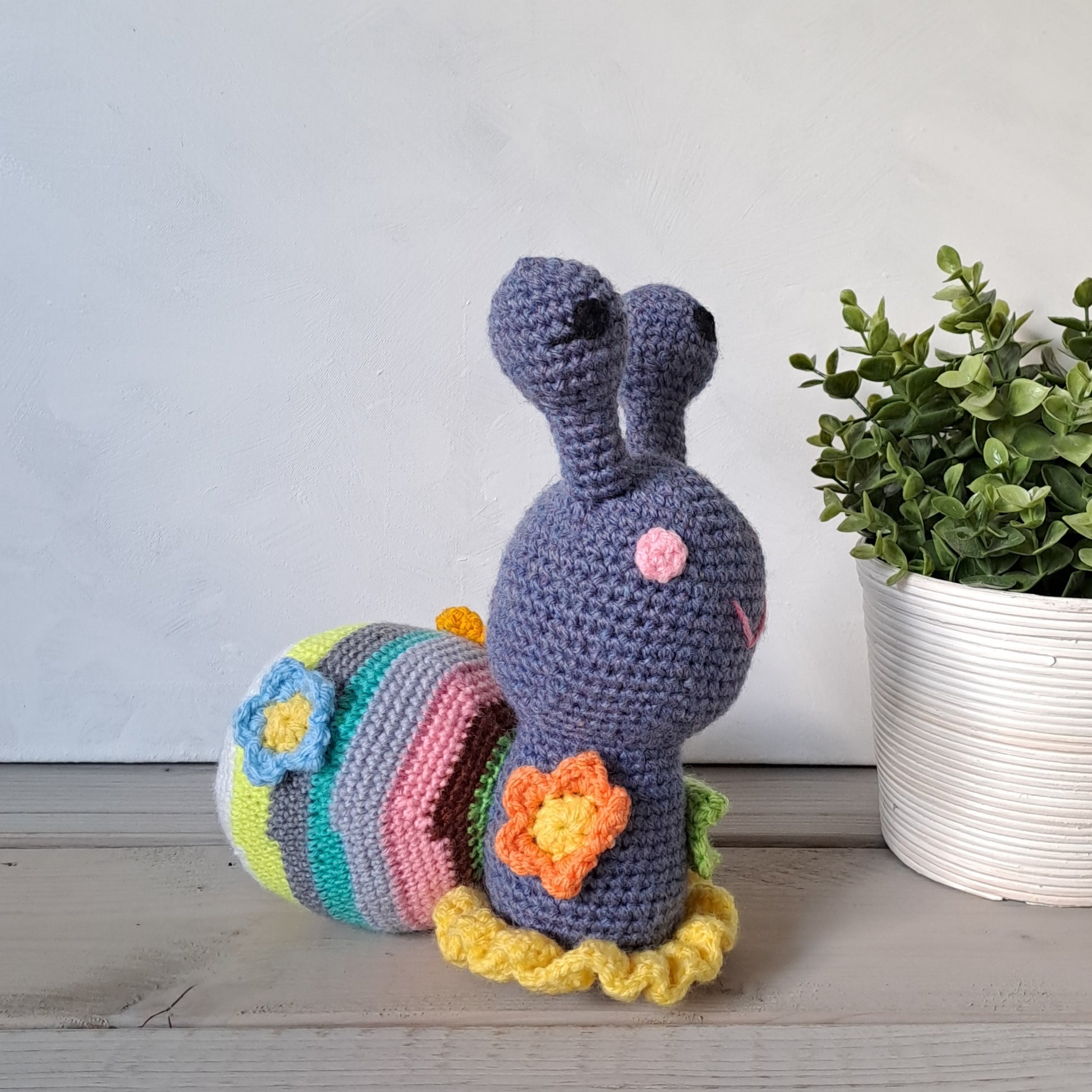 Van deze slak met lief gezicht, kleurrijk gestreept huisje en bloemetjes wordt je toch meteen vrolijk!