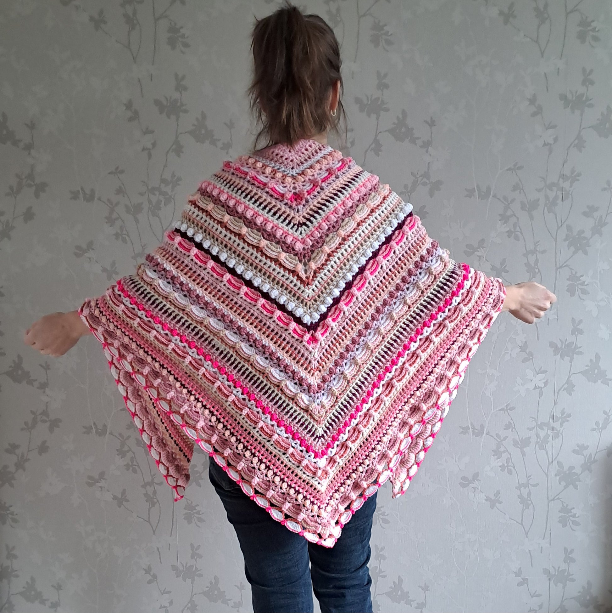 Roze omslagdoek: ca 92cm x 190cm; bevat geen wol.