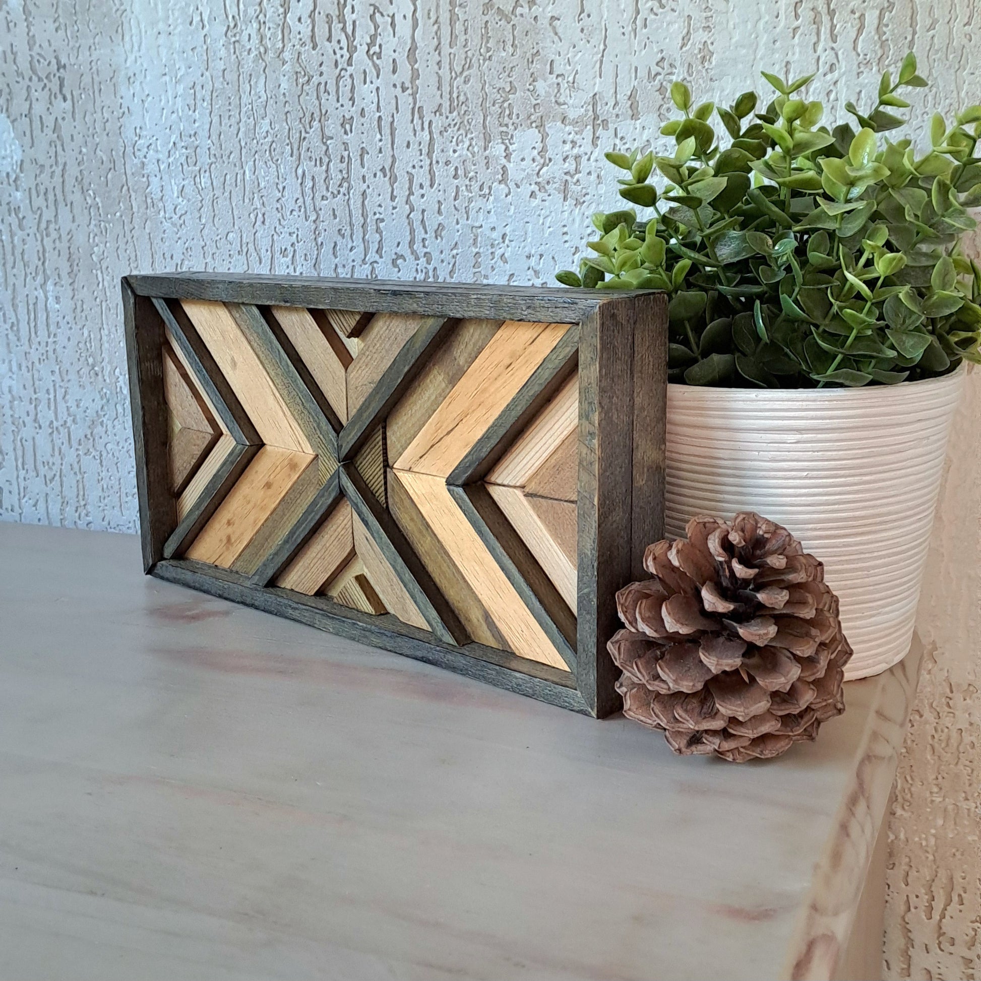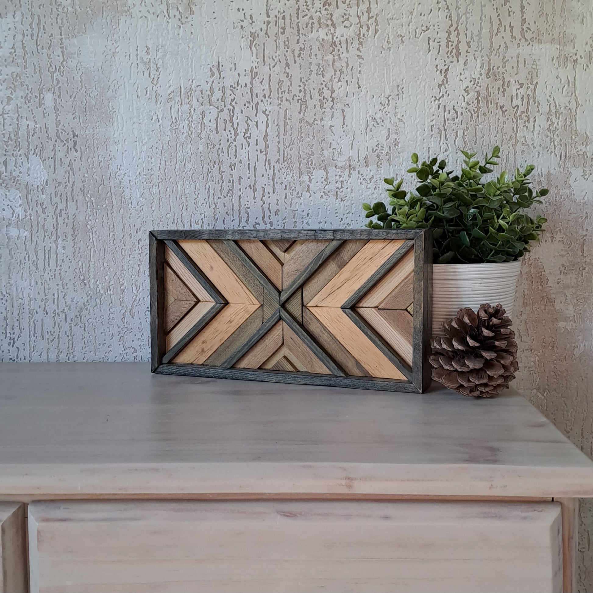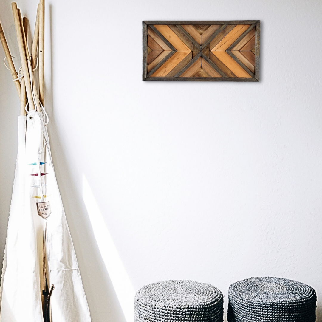 Klein formaat karakteristiek houten wandornament, handgemaakt van 100% gerecycled hout in een symmetrisch patroon.