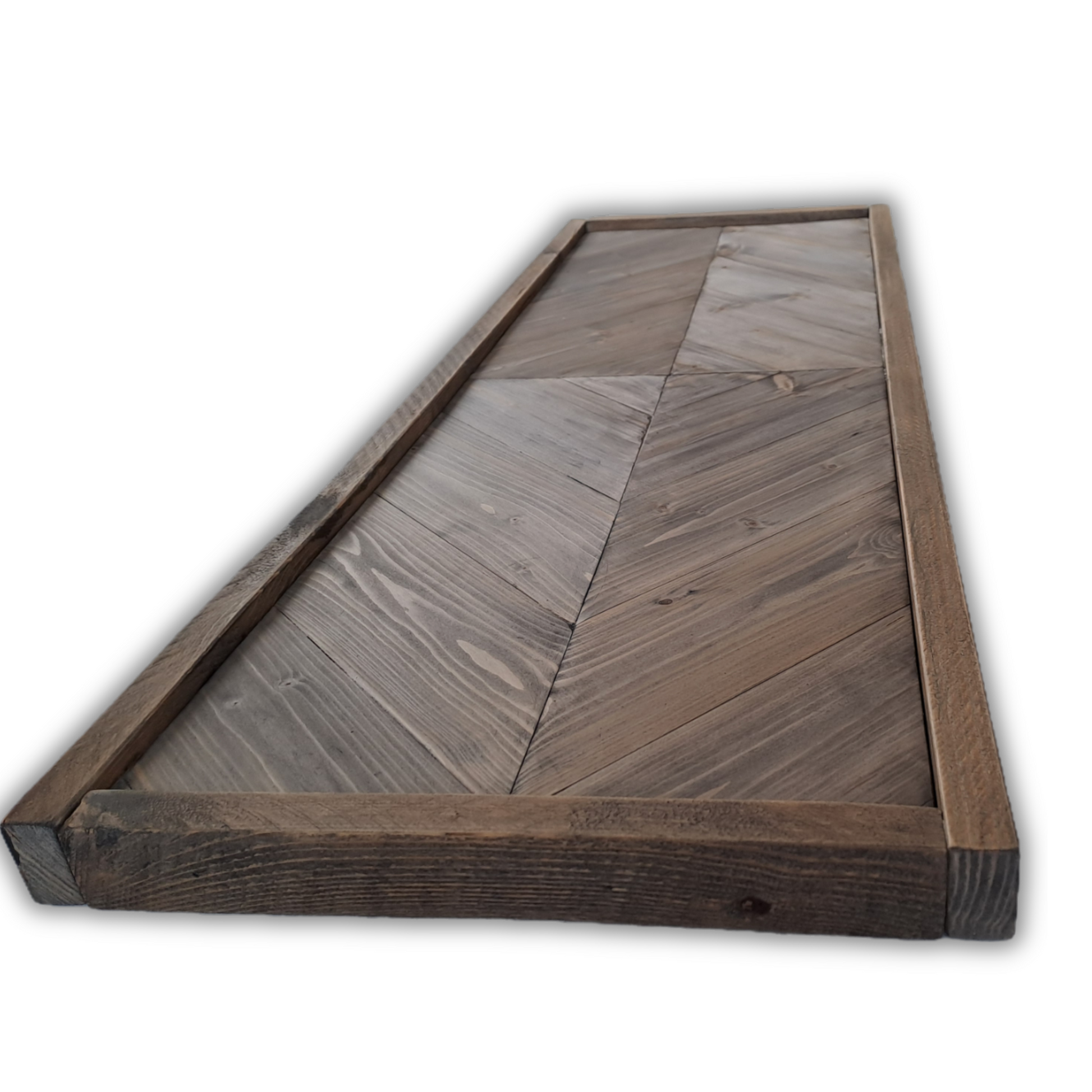 Een uniek houten wandornament in een strak en eenvoudig patroon in vergrijsde look.